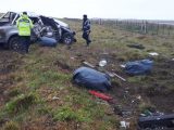 Al llegar los uniformados al lugar, conjuntamente con personal bomberil tolhuinense, se encontraron con un rodado Renault Kangoo II Express, de color blanco, conducido por el turista francés Guillaume Henri Albert Torrent, a quien acompañaba Stella Maris Aguiar, con abolladuras en su estructura y un automotor Peugeot 208 Allure, de color negro, al mando de Fernando Nali Saccente, y Laura Natalia Cuelli a su lado, ambos turistas procedentes de la provincia de Buenos Aires, volcado.