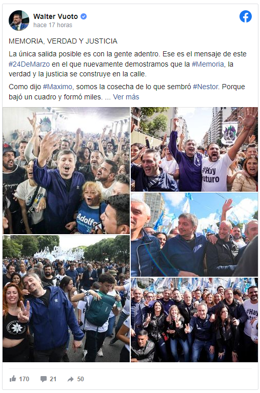 «La única salida posible es con la gente adentro. Ese es el mensaje de este #24DeMarzo en el que nuevamente demostramos que la Memoria, la verdad y la justicia se construye en la calle», expresó Vuoto.