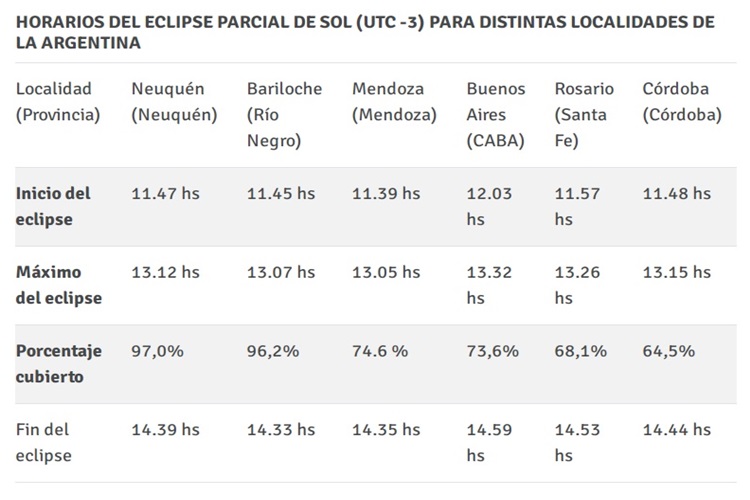 En la capital de Neuquén será a las 13:12.14,1 (Hora Oficial Argentina), con el astro rey cubierto en un máximo del 97,05%.