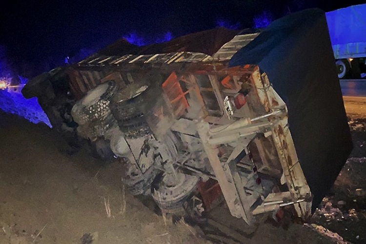 Un camión que transportaba tambores con aceite, volcó en la Ruta Nacional Nº3 a la altura del kilómetro 2934.
