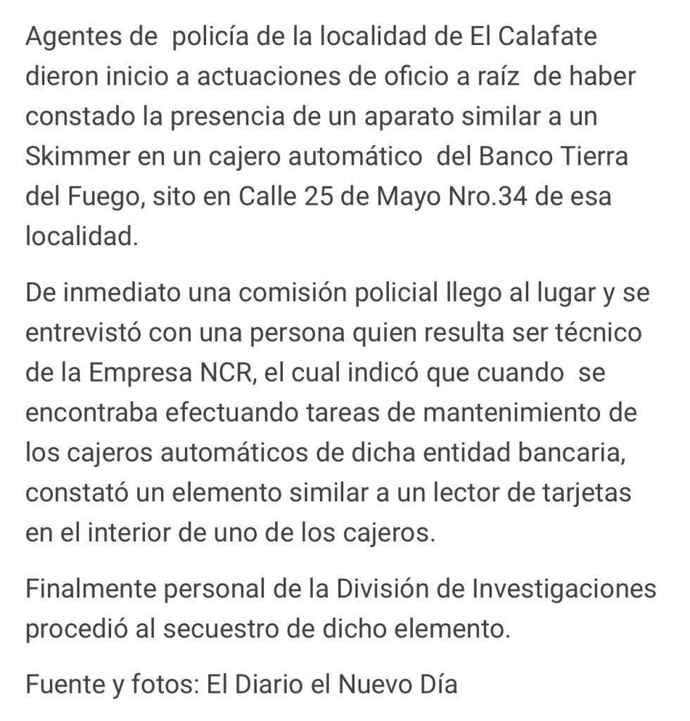 Una mujer policía que realizaba servicio de Policía Adicional en Banco Tierra del Fuego sito en Calle 25 de Mayo N° 34 de El Calafate, constató la presencia de un aparato similar a un Skimmer que sirve para clonar tarjetas.