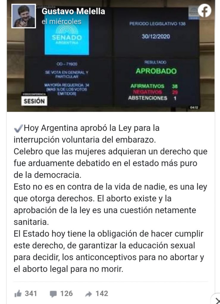 «Hoy Argentina aprobó la Ley para la interrupción voluntaria del embarazo. Esto no es en contra de la vida de nadie, es una ley que otorga derechos: el aborto existe y la aprobación de la ley es una cuestión netamente sanitaria», enfatizó el mandatario.