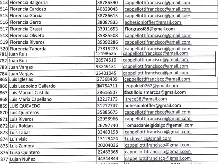 En ese contexto, Loffler presentó un listado con 1445 avales a su candidatura y la sorpresa se dio a conocer ahora cuando se tuvo acceso a las planillas de avales donde aparece el nombre y el apellido de cada uno de quienes apoyaron la candidatura de Loffler, junto a su documento de identidad y a una dirección de correo electronico.