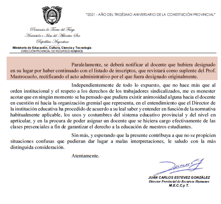 La nota del Ministerio la firma el Director Provincial de Recursos Humanos, J