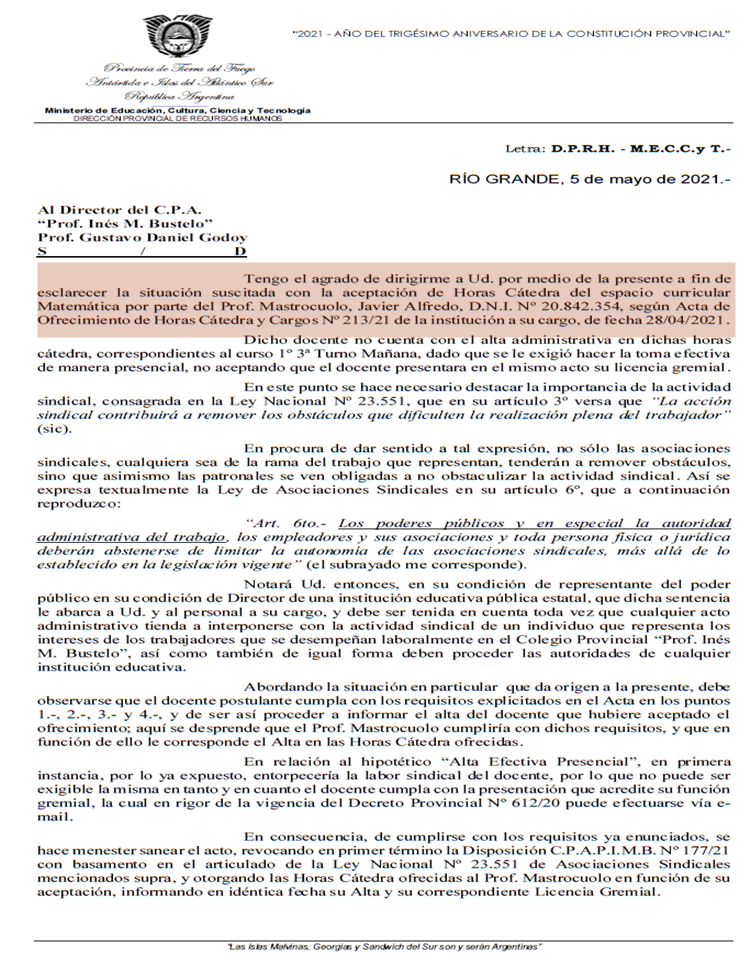 Concluyendo que «se hace menester sanear el acto, revocando en primer término la Disposición C.P.A.P.I.M.B. Nº 177/21 con basamento en el articulado de la Ley Nacional Nº 23.551 de Asociaciones Sindicales mencionados supra, y otorgando las Horas Cátedra ofrecidas al Prof. Mastrocuolo(*) en función de su aceptación, informando en idéntica fecha su Alta y su correspondiente Licencia Gremial.»