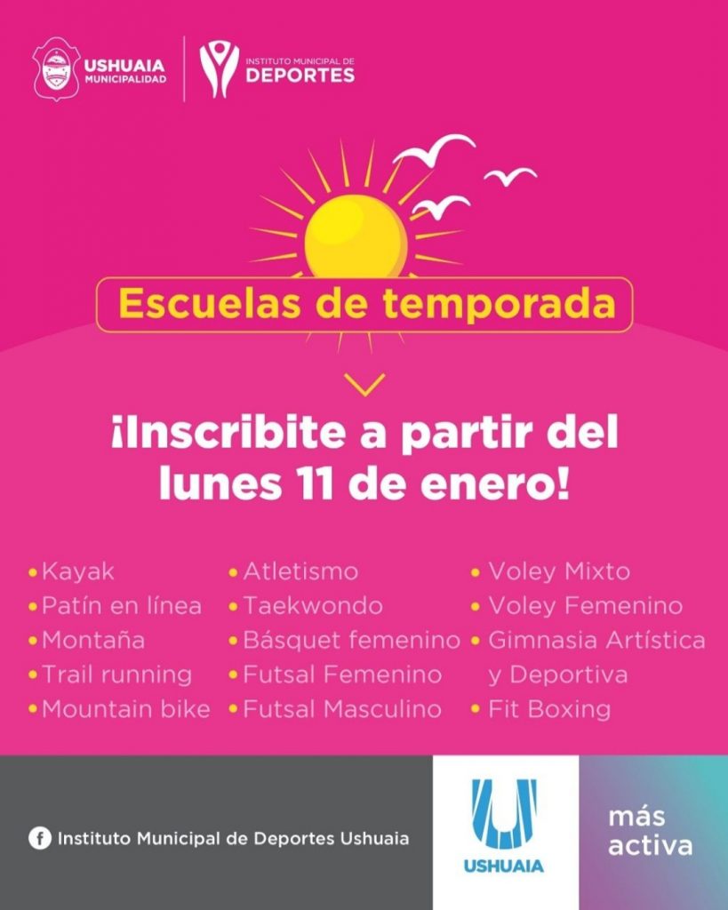 Las inscripciones se llevarán a cabo a través de la página de Facebook del IMD, https://www.facebook.com/Instituto-Municipal-de-Deportes-Ushuaia-100334044949315/, el lunes 11 de enero desde las 14 Hs. Podrán anotarse en Kayak, Patín en línea, Trail running, Mountain Bike, Atletismo, Taekwondo, Basquet Femenino, Futsal Femenino,Futsal Masculino, Beach Vóley mixto, Vóley  mixto, Vóley Femenino, Gimnasia artística y deportiva, y Fit Boxing.