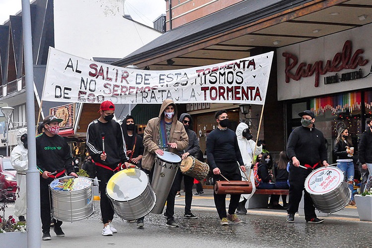 A la intervención de Lo-eventual se han sumado percusionistas del “Colectivo Afro Fueguino” y de la agrupación “Tambores del Sur”, el estruendo de los tambores le da el marco sonoro a esta escena ambulante de “La Tormenta”.